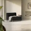The Essential Armless Chair balances aesthetic refinement with enduring comfort. An exposed, upcycled wood base features Japanese joinery details, while generously padded integrated cushions maintain a loungeable taper and provide resilient comfort. Upholstered in premium performance fabrics selected for their texture and longevity. Innovative design composed of separate wood base and nesting seat units.
