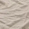 Close-up of a beige, quilted fabric with visible stitching creating a grid pattern. The surface appears soft and slightly wrinkled, giving a cozy and comfortable texture.