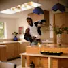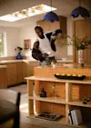 SF: One of my friends that helped me put together the home had an idea to quite literally blow up these balloons and put paper mache on the outside of them and let them dry into the shape of the pendants that you see. Because of that, we got to paint it any color we wanted. I love the cobalt blue that we found. Now, every time I come home, I get to see that little pop of blue over the counter.