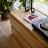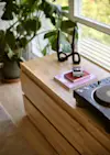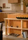 Nest Media Console, in Natural | Marbled Wool Rug, in Sand | Classic Dog Bed, in Natural and Dune