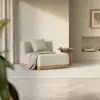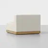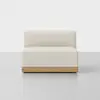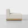The Essential Armless Chair balances aesthetic refinement with enduring comfort. An exposed, upcycled wood base features Japanese joinery details, while generously padded integrated cushions maintain a loungeable taper and provide resilient comfort. Upholstered in premium performance fabrics selected for their texture and longevity. Innovative design composed of separate wood base and nesting seat units.