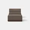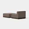 The Essential Armless Chair balances aesthetic refinement with enduring comfort. An exposed, upcycled wood base features Japanese joinery details, while generously padded integrated cushions maintain a loungeable taper and provide resilient comfort. Upholstered in premium performance fabrics selected for their texture and longevity. Innovative design composed of separate wood base and nesting seat units.